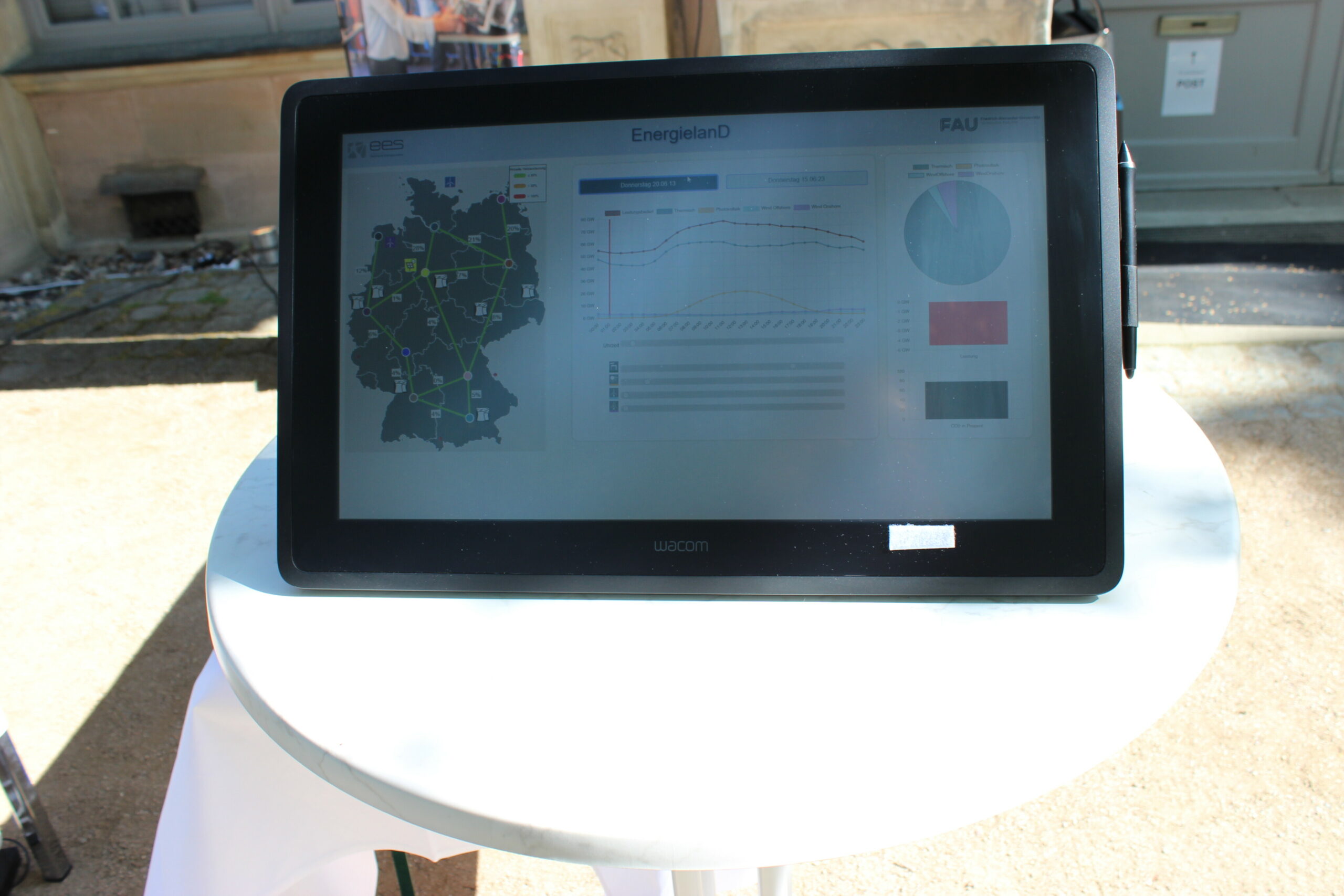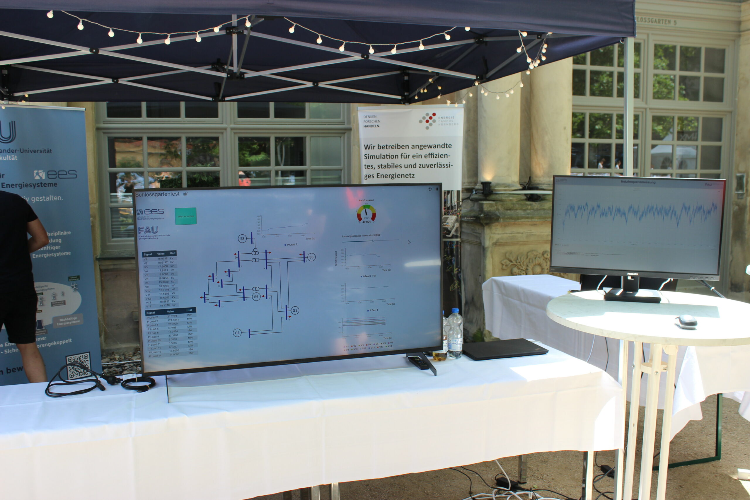So gab es Exponate echter Betriebsmittel wie beispielsweise Kabel und Freileitungen zum Anfassen. Daneben konnten die Besuchenden an einem Energiequiz ihr Wissen zu technischen und allgemeinen Fragestellungen der Energiewende überprüfen. Auf einem großen Fernsehbildschirm und mit einem Schieberegler ausgestattet konnten sich Interessierte als „Netzbetreiber“ an der Leistungs-Frequenz-Regelung in einem simulierten Netz versuchen. Die Simulation lief dabei auf unserem Echtzeitsimulator am Energiecampus in Nürnberg, sodass lediglich die Visualisierung im Schlossgarten vor Ort war. Daneben war auf einem Monitor die tagesaktuelle Frequenz des kontinentaleuropäischen Netzes dargestellt, um den Besuchenden zu vermitteln wie komplex die Einhaltung des Leistungsgleichgewichts ist. Als letzte Station konnte über unser EnergielanD-Tool die Folgen von Zubau von PV- und Windkraftanlagen ohne Veränderung an der Übertragungskapazität des deutschen Netzes nachvollzogen werden. Dies würde massive Leitungsüberlastungen zur Folge haben, die nur durch starke Abregelung der Einspeisungen aus den PV- und Windkraftanlagen verhindert werden können.