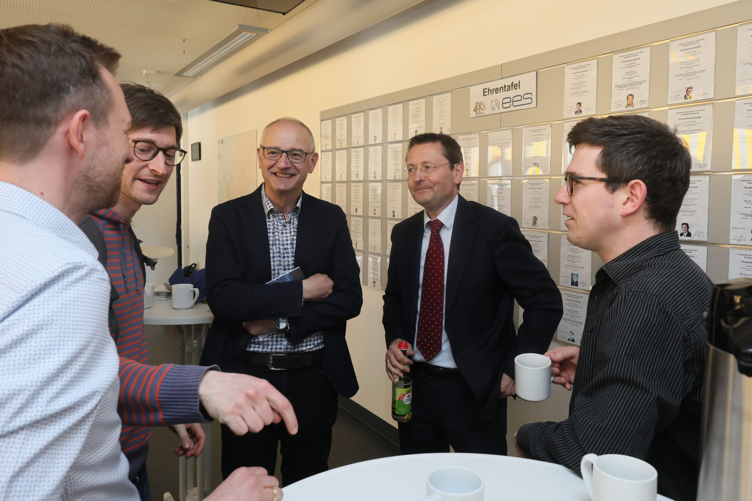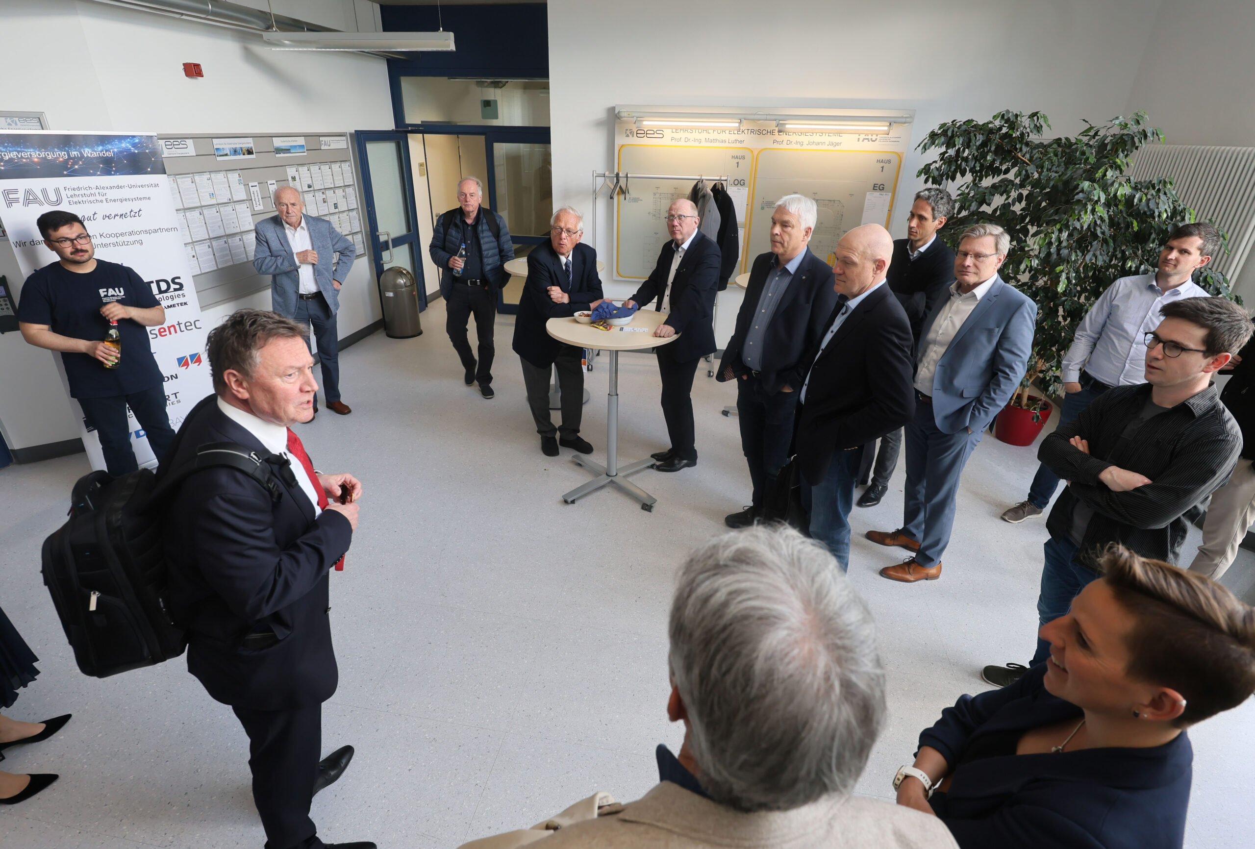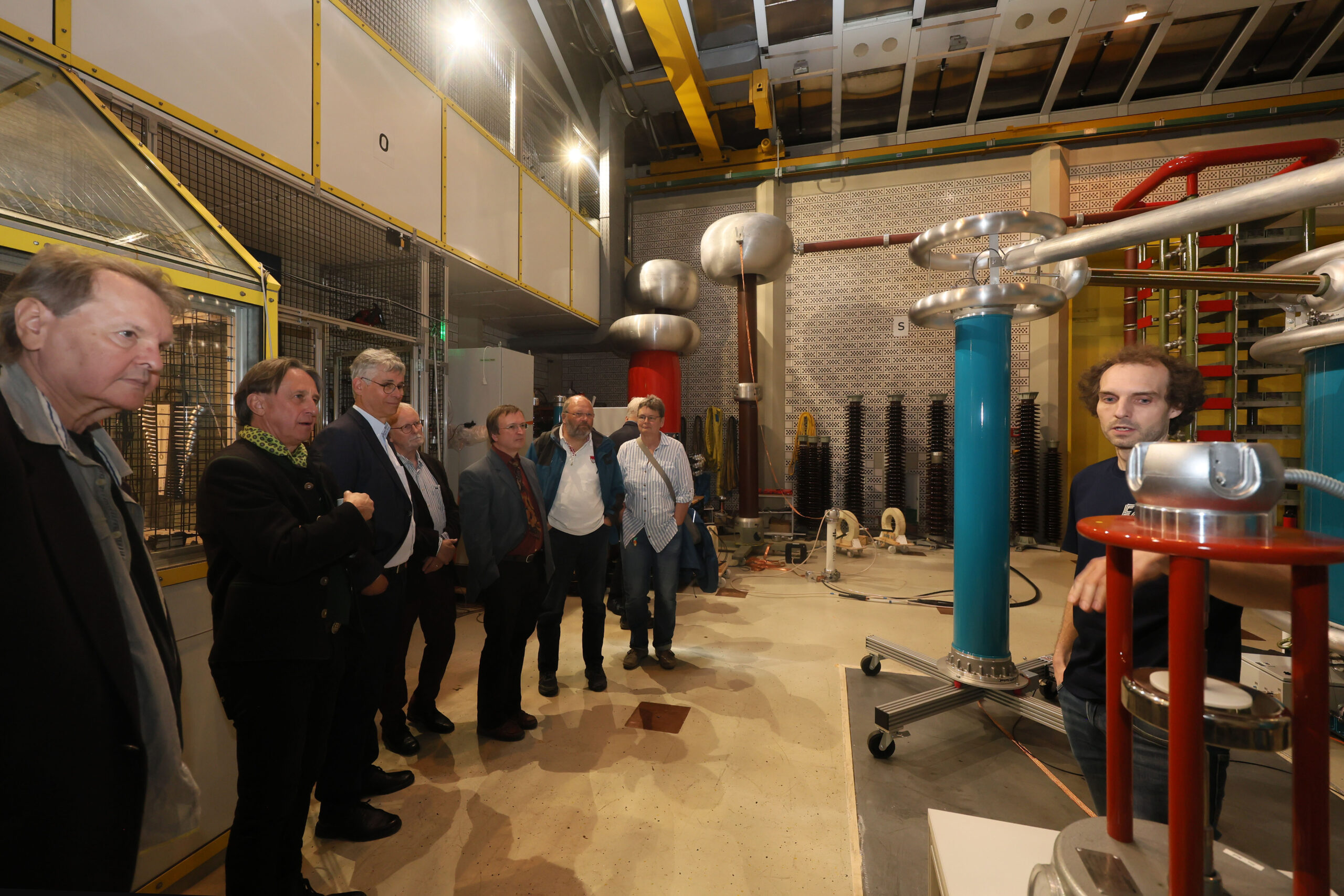 Nach den beiden Gastvorträgen erwartete die Gäste eine Führung durch unseren Standort in der Cauerstraße. Vor Ort gaben die Mitarbeitenden Einblicke, wie Lehre und Forschung in den Laboren des EES praktisch umgesetzt werden. „Für die Studierenden ist es einfach mal gut zu sehen, ob ihre Berechnungen auch in der Praxis bestehen“, erklärt Tobias Lorz mit Blick auf die Gruppenübungen im Labor Drehstrom-Demonstrator-Modell (DDM). Auch die Hochspannungsprüfanlagen öffneten ihre Türen und boten spannende Einblicke in die Materialprüfung, Forschung und die Zusammenarbeit mit der Industrie. Egal ob bei Kaffee oder in den Laboren – beim Austausch kamen neben dem Fachlichen auch kollegiale Begegnungen nicht zu kurz.