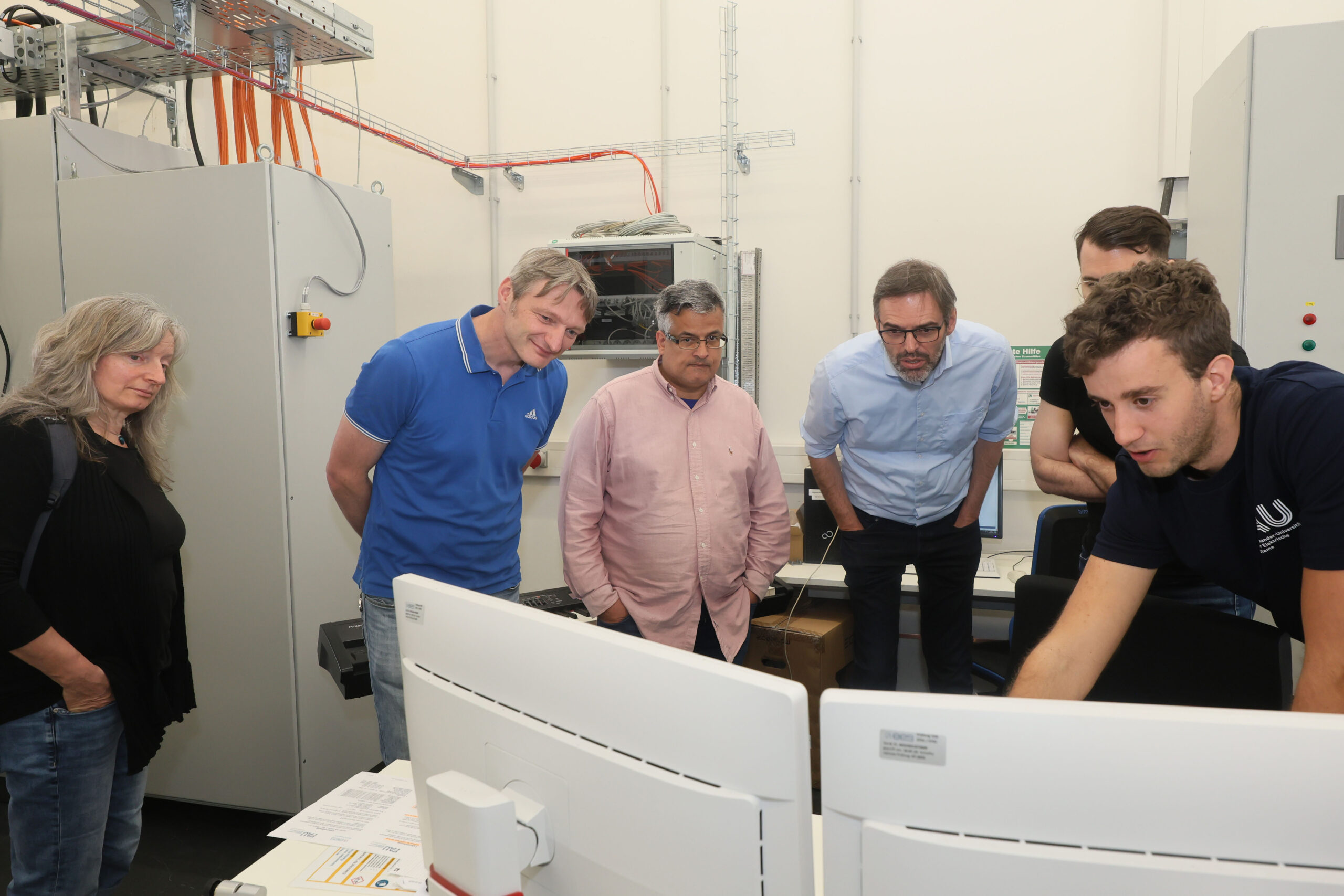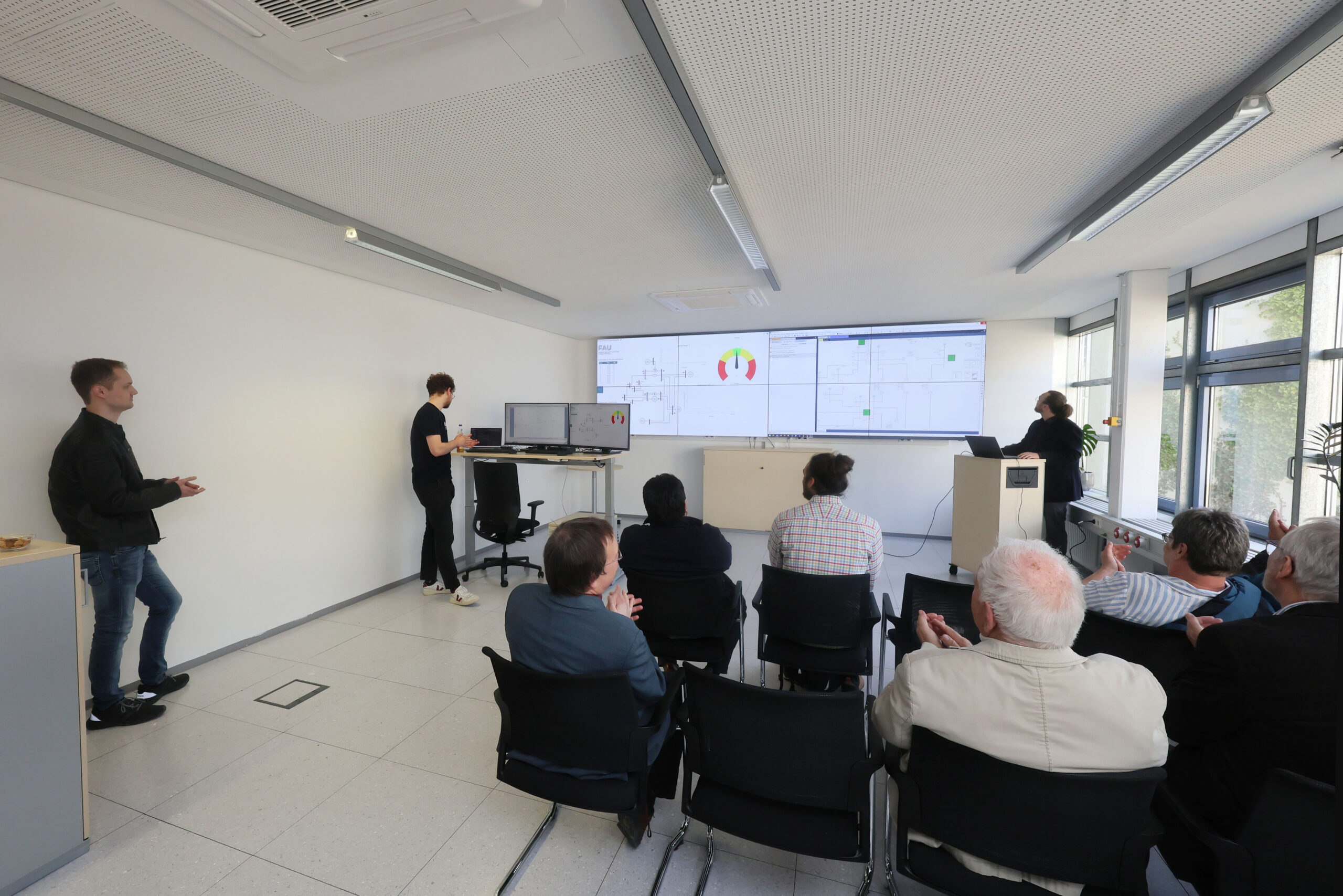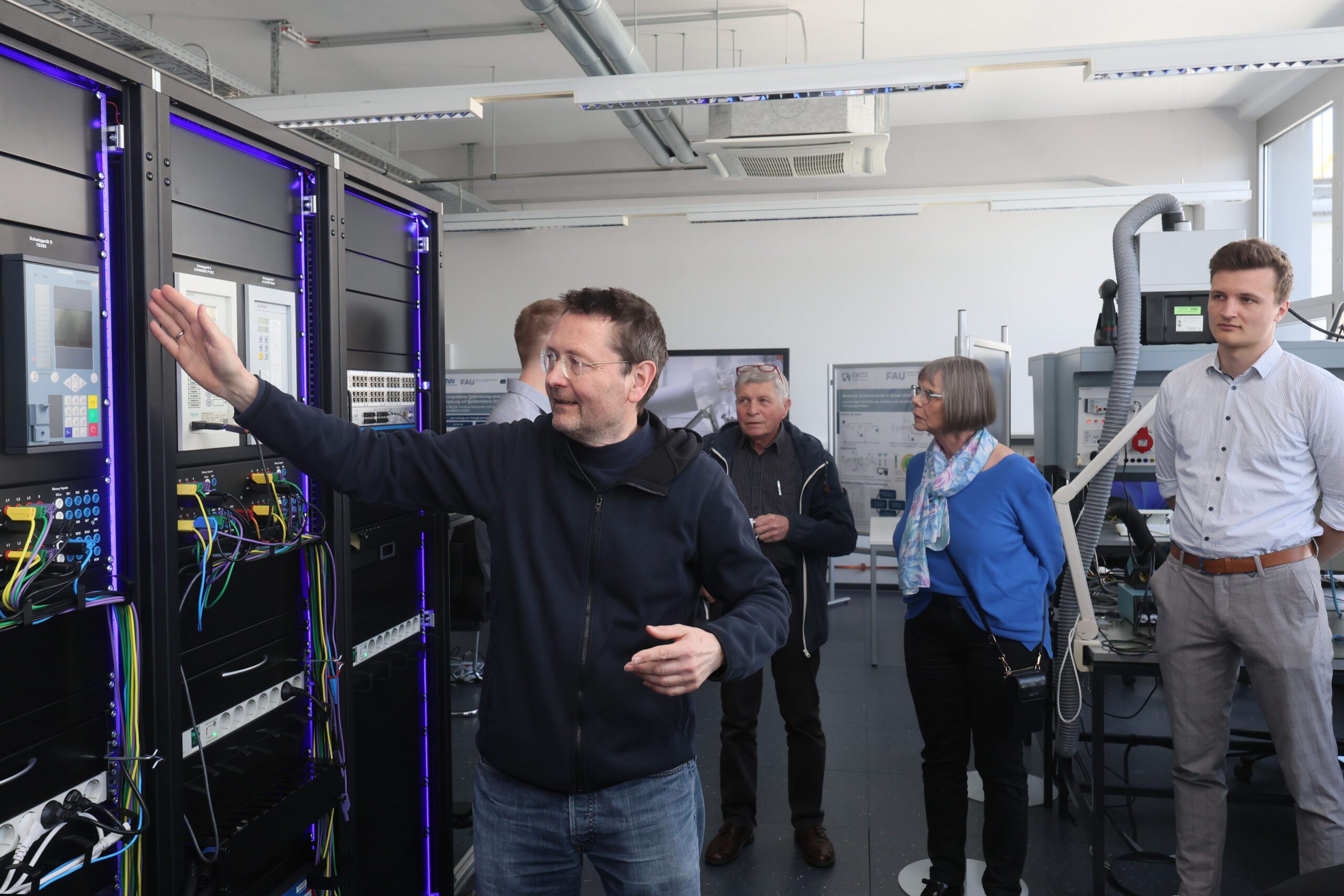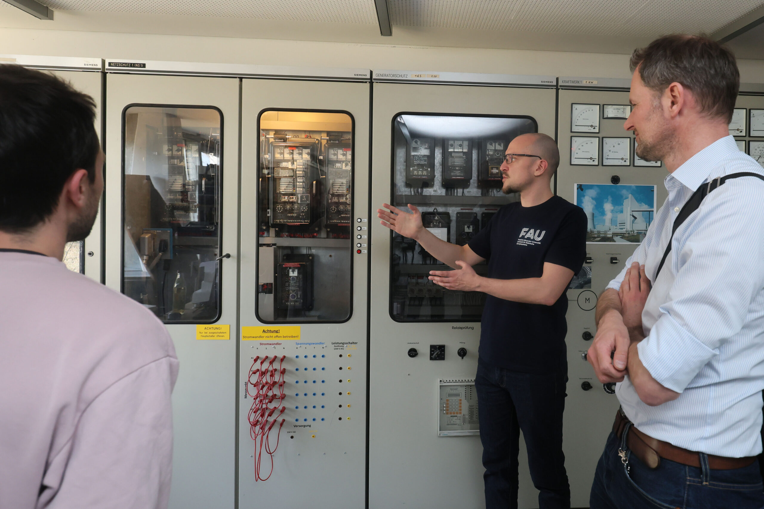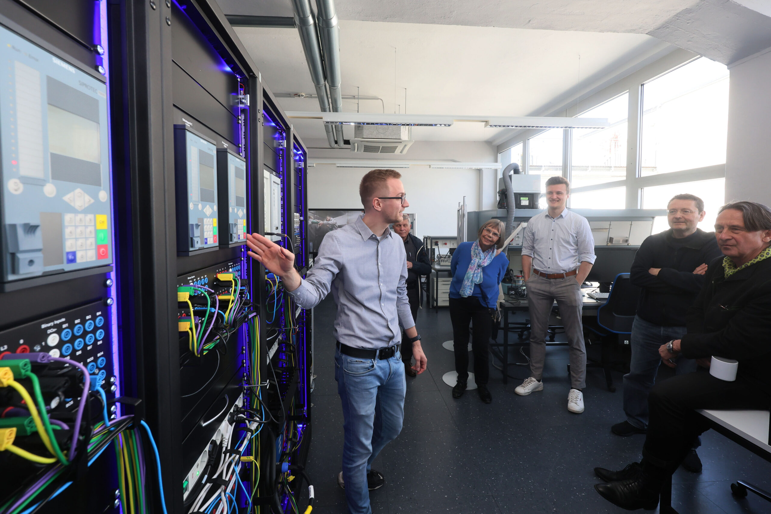 Am Samstag, den 12. April, ging es aus Erlangen dann zum Lehrstuhlstandort „Auf AEG“ im Nürnberger Norden. Dort präsentierte Standortleiter Dr. Mehlmann die Spezialisierung des Standorts: die Echtzeitsimulation elektrischer Systeme. „In der Simulations- und Schutztechnik kommt man daran nicht vorbei“, betonte Dr. Gert Mehlmann und unterstrich die zentrale Rolle des Standorts für die Validierung in der Forschung. Ein besonderes Highlight ist das angeschlossene Niederspannungslabor, das es ermöglicht, „virtuelle und reale Welten zu verbinden“ – ein Ansatz, der auch bei der anschließenden Laborführung anschaulich demonstriert wurde.
